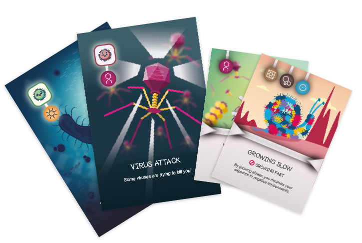 Each round the world shifts: intense sunlight, viral invaders, resource scarcity, changing habitats. Play Trait Cards to defend your colony, exploit opportunities, and sabotage other species in an all-out microbial showdown.